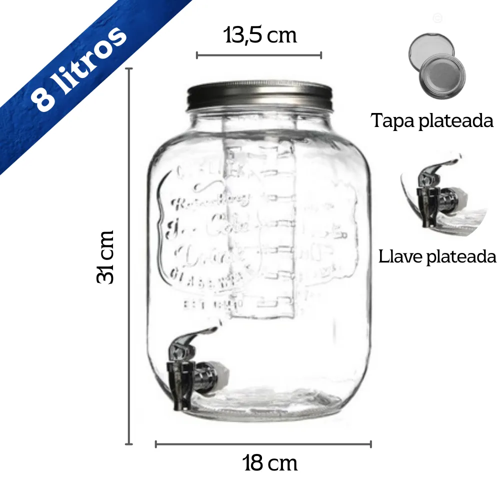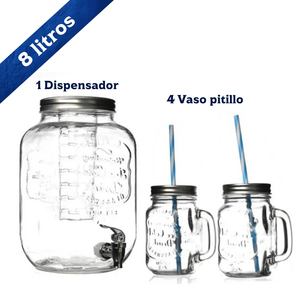 El Dispensador Vintage 8 litros + 4 vasos con pitillo es la opción perfecta para reuniones, eventos y celebraciones. Su diseño clásico tipo mason jar incluye grifo metálico, infusor interno para frutas y hierbas, y 4 vasos vintage con tapa y pitillo reutilizable. Ideal para servir limonadas, jugos, cocteles o aguas saborizadas con un estilo elegante y funcional.