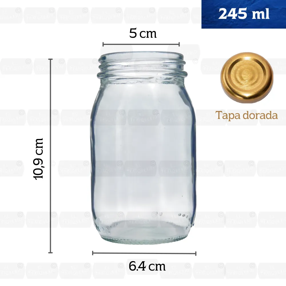Este frasco de vidrio 245 ml (ref EA1261-53) es el envase multiusos perfecto para tu cocina u hogar . Con una capacidad ideal de 245 ml, es la solución perfecta para conservar alimentos, envasar mermelada, miel, cremas o preparaciones especiales, así como líquidos o granos. Fabricado en vidrio de alta calidad, es apto para múltiples proyectos. Viene con un cierre hermético de tapa rosca metálica de color dorado.